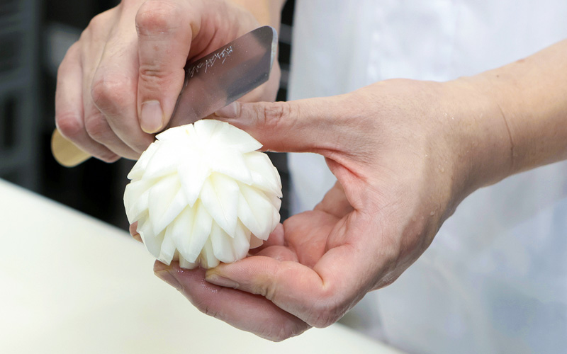 料理をより楽しんでいただくため、野菜には面取りや隠し包丁を施すなど京料理ならではの繊細な技術を活かし、手間を惜しまず日々のお食事をご用意いたします。